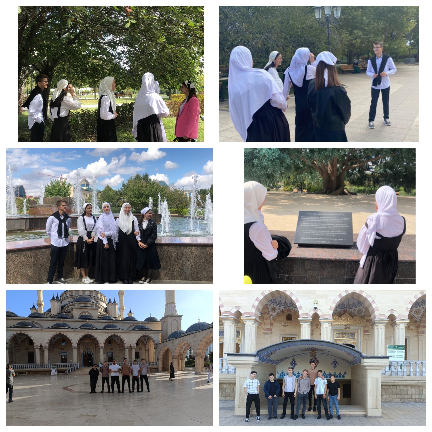 Далее продолжил свой рассказ классный руководитель 9 класса Гайсумов З.А. Он рассказал ребятам о мечети «Сердце Чечни», одной из самых больших мечетей мира. Открыта она 17 октября 2008 года и названа именем Ахмат-Хаджи Кадырова, первого президента Чеченской Республики. Мечеть располагается на живописном берегу реки Сунжа, посреди огромного парка (14 га) и входит в Исламский комплекс, в который, помимо мечети, входят Российский Исламский университет им. Кунта-Хаджи и Духовное управление мусульман ЧР. Мечеть построена в классическом османском стиле. Центральный зал мечети накрыт огромным куполом (диаметр — 16 м, высота — 32 м). Высота четырёх минаретов по 63 метра — одни из самых высоких минаретов на Юге России. Наружные и внутренние стены мечети отделаны мрамором-травертином, а интерьер декорирован белым мрамором. Площадь мечети составляет 5000 квадратных метров, а вместимость более 10 тысяч человек. Столько же верующих могут молиться и в примыкающей к мечети летней галерее и площади. Далее ребята доехали до парка им. Хусейна бен Талала. Здесь учащиеся провели обзорную экскурсию и немного отдохнули.
