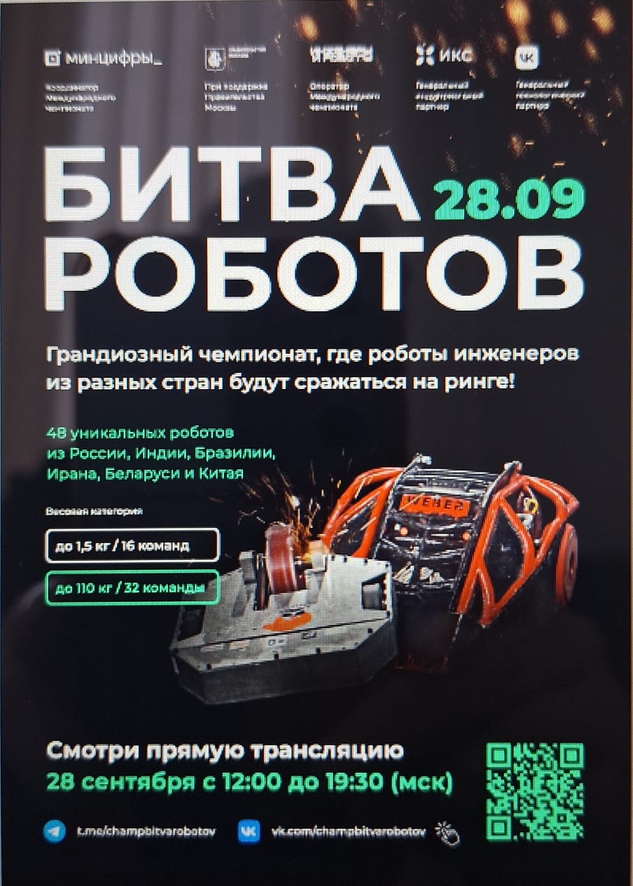 24.09.2024Минцифры России в соответствии с распоряжением Правительства РоссийскойФедерации от 11 апреля 2023 г. № 889-р сообщает о старте нового сезона Международного чемпионата по битве роботов (далее - Чемпионат), который способствует продвижению инженерной мысли как драйвера развития и поддержки современных цифровых технологий. Впервые в 2024 году Чемпионат пройдет по двум дисциплинам:«Битва роботов» для участников всех возрастов с роботом весом до 110 килограмми новая дисциплина «Битва мини-роботов» для участников 10-17 лет с роботом весом до 1,5 килограмм. Первый отборочный этап Чемпионата пройдет 28 сентября 2024 г. при поддержке Правительства Москвы на территории спортивного комплекса«ЦСКА Арена» (далее - мероприятие). Участники первого этапа - 48 команд из России, Беларуси, Бразилии, Индии, Ирана и Китая. Программой мероприятия предусмотрено два шоу: дневное (с 12:00 до 15:20) и вечернее (с 17:00 до 19:20).