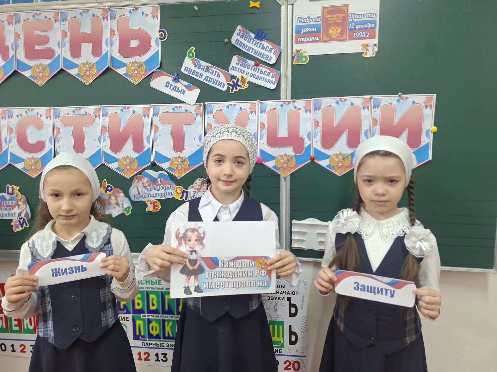 В школе № 106 города Грозного к этой важной дате подготовили цикл мероприятий для повышения правовой грамотности учеников. Центральным событием стал классный час «Конституция – основной закон государства». Школьники узнали об истории принятия Конституции, её значении и ключевых положениях, а также о важности соблюдения законов и прав. Ребята активно обсуждали, делились мнениями и задавали вопросы.