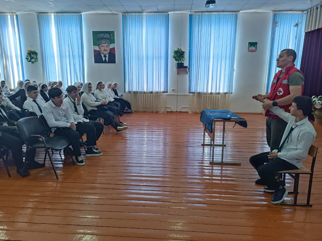 В рамках реализации нацпроекта «Молодежь и дети» в нашей школе был проведен мастер-класс по оказанию первой доврачебной помощи, организованный департаментом образования Мэрии г. Грозного совместно с республиканским отделением Российского Красного Креста. Представители красного креста рассказали и наглядно показали, как нужно оказывать первую помощь при остановке сердца и кровотечениях. Ребята учились чётко и грамотно действовать по оказанию 1-ой медицинской помощи и попробовали свои навыки. Мастер - класс был очень интересным, полезным и познавательным.
